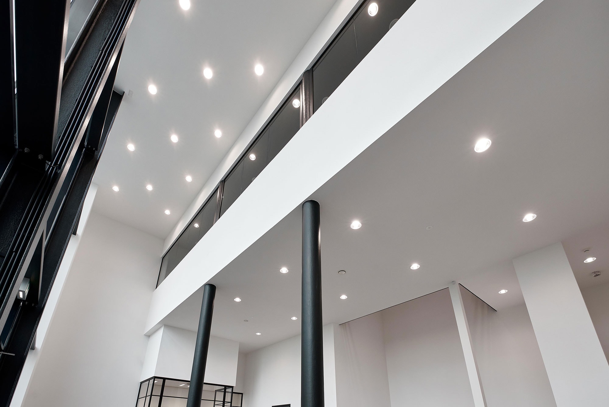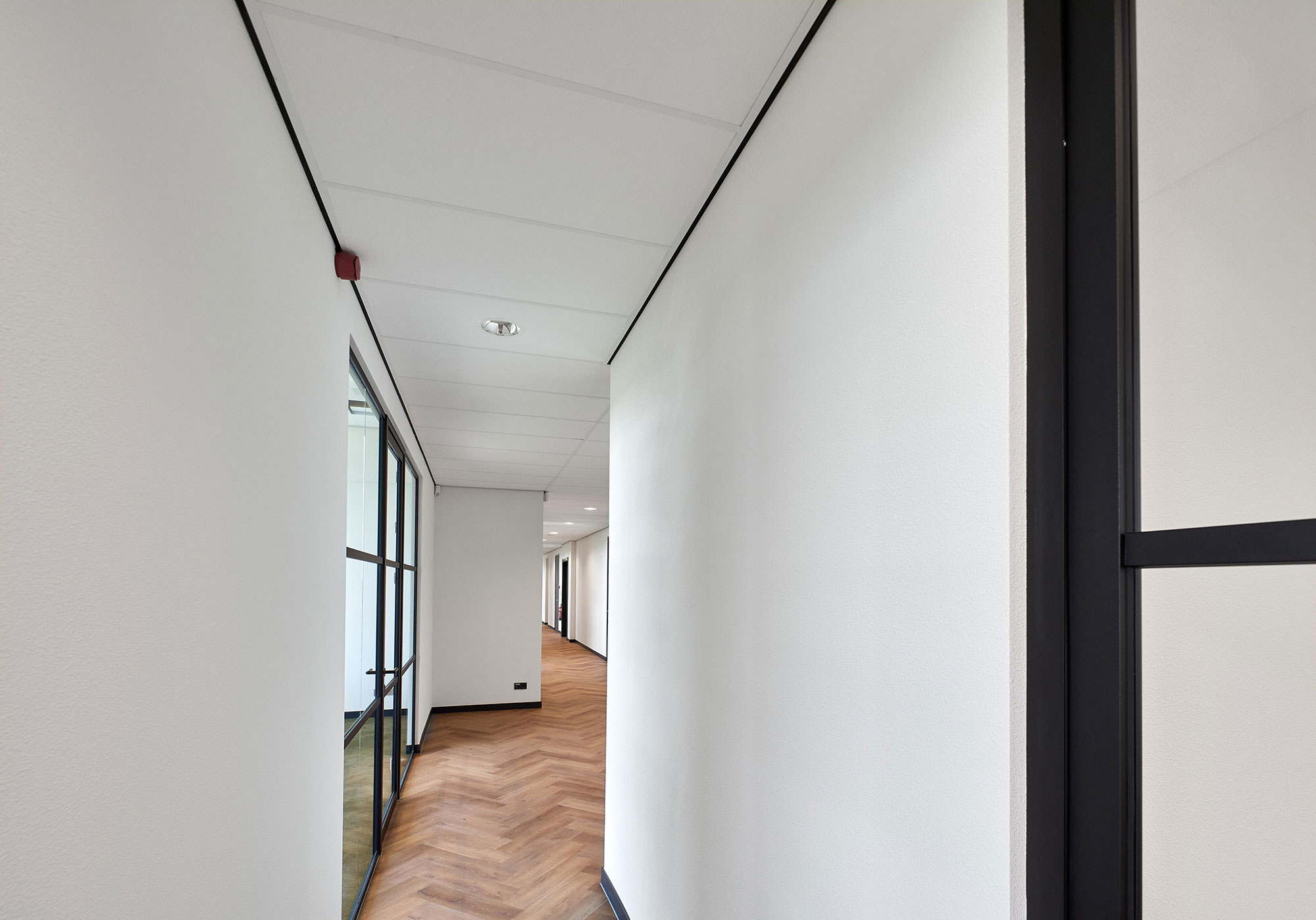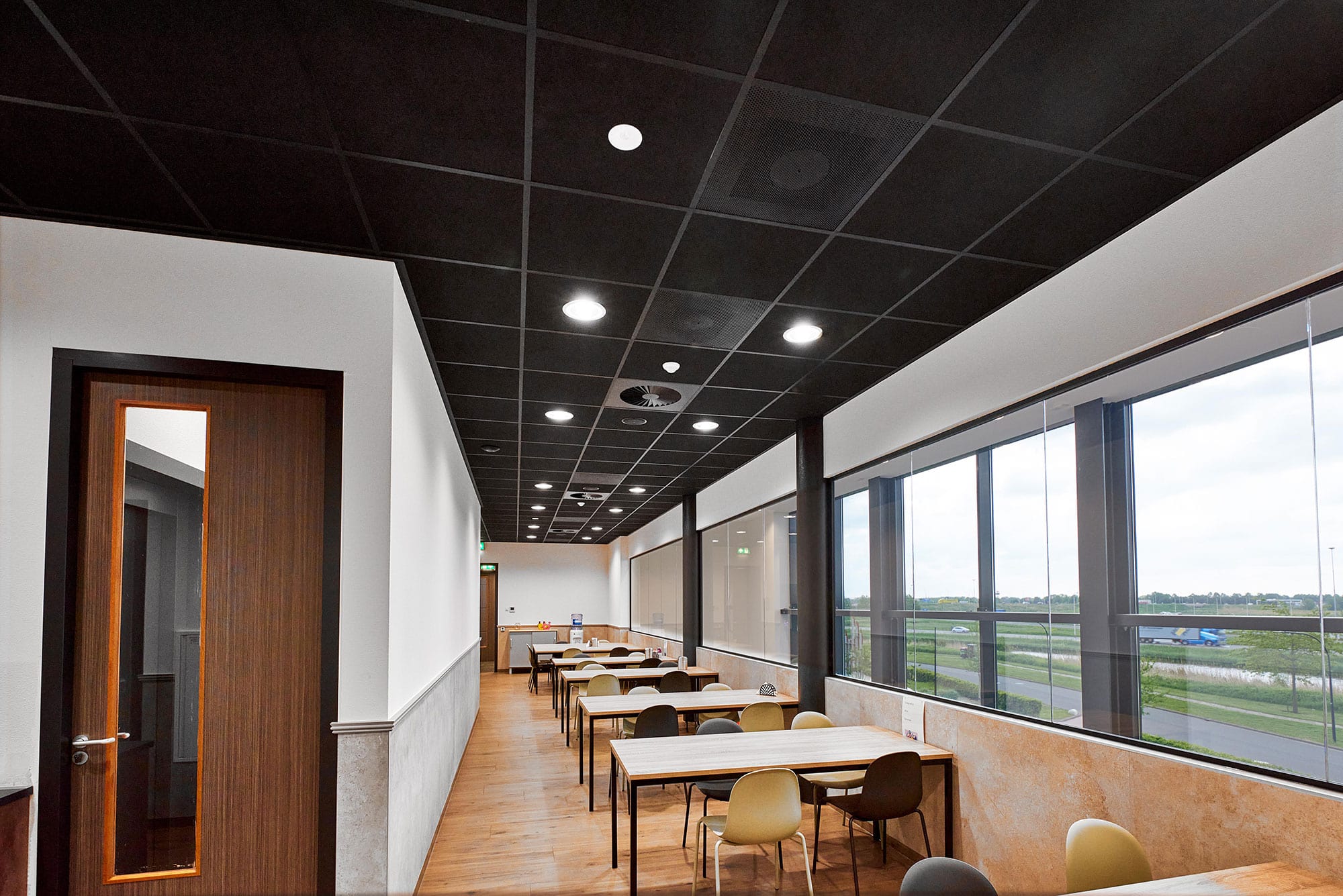 In de plafonds is gekozen voor een combinatie van twee verschillende plafondplaten. Een frisse witte inlegtegel voor de kantoren, gangen en toiletten en een sfeervolle zwarte (Rockfon Cinema) voor de kantine. Beiden met een hoge geluidsabsorptie. Met name de manier waarop deze plafonds zijn bevestigd is bijzonder te noemen. Er is gewerkt met een innovatieve techniek, waarvoor vrijwel niet geboord is. In plaats daarvan is alles gemonteerd met behulp van een supersterke lijm.