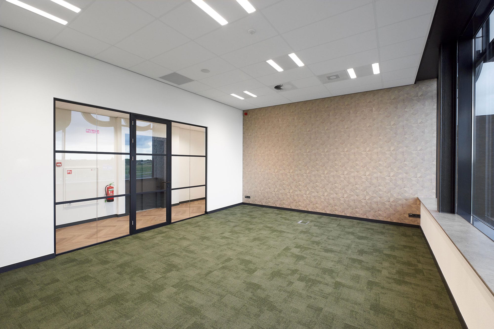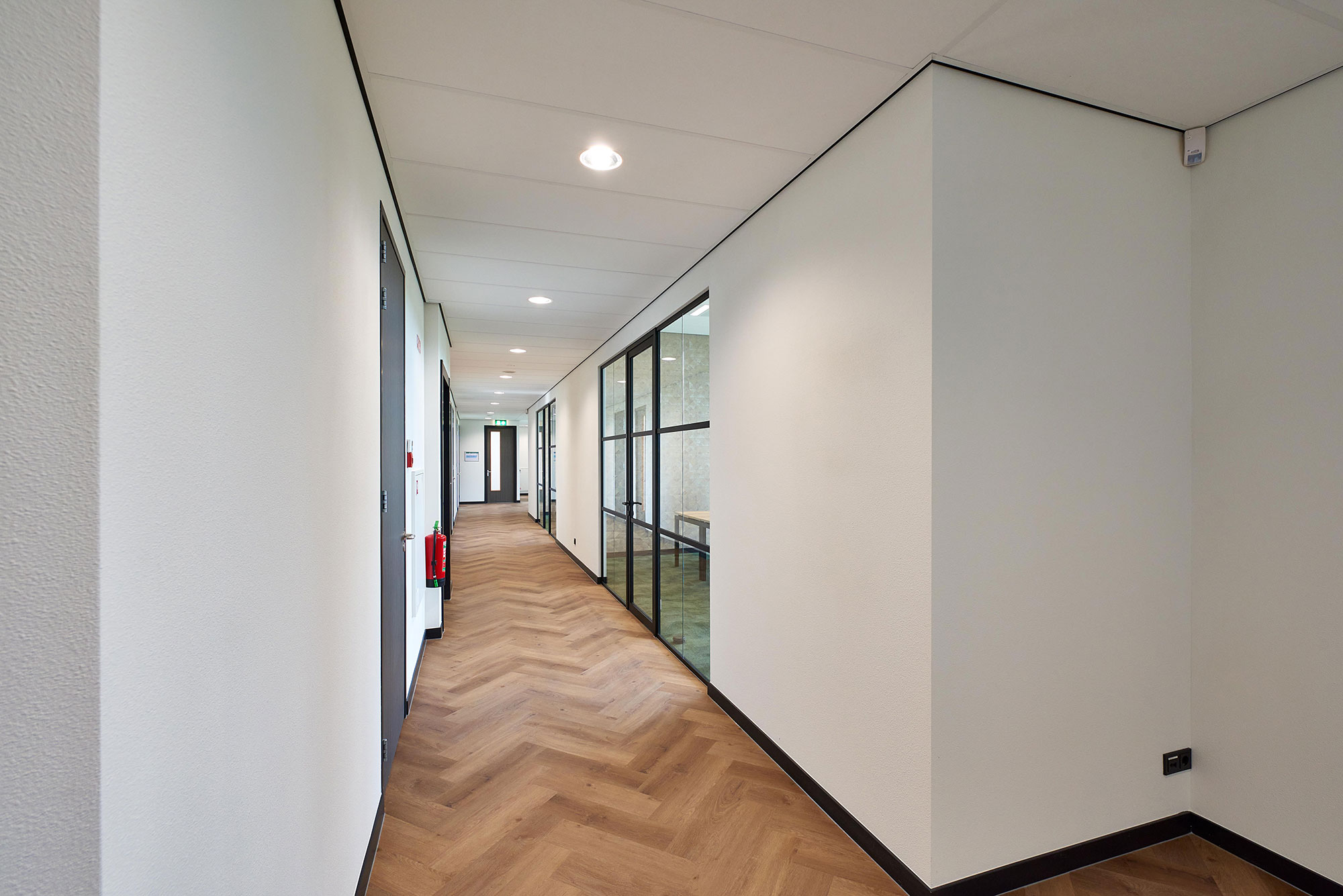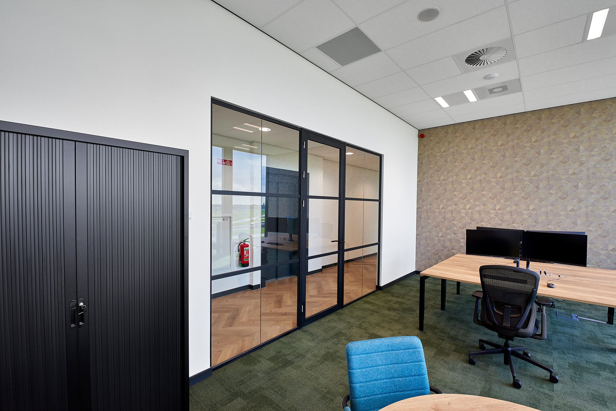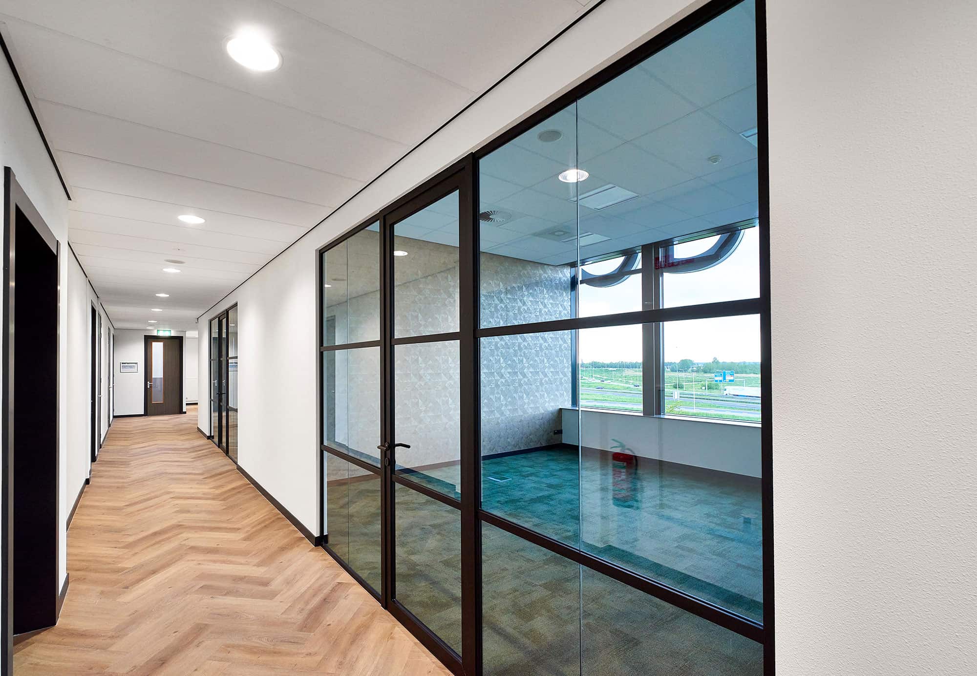 De kantoren zijn grotendeels ingedeeld met een combinatie van gesloten en transparante wanden. De scheidingswanden tussen onder meer de kamers maakten we met metalstudsystemen. Een deel van die wanden is heel transparant gehouden. We gebruikten hiervoor de strakke Obiwand; glas in slanke donkere aluminiumprofielen. Een voorkeur van de opdrachtgever zelf, waar wij graag in meegingen.